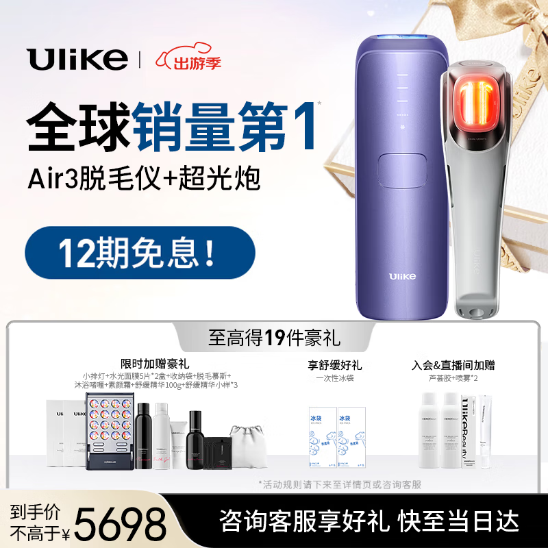 Ulike【超值嫩肤淡斑脱毛套组】超光炮美容仪器 蓝宝石冰点脱毛仪Air3水晶紫 牛奶光淡斑祛痘印嫩白价格:5698.00元!