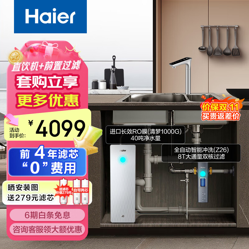 海尔(Haier)净水器清梦1000G鲜活水pro家用净水机5年RO反渗透厨下直饮进口膜+前置过滤器HKC2400-R882D2U1+Z26价格:4099.00元!
