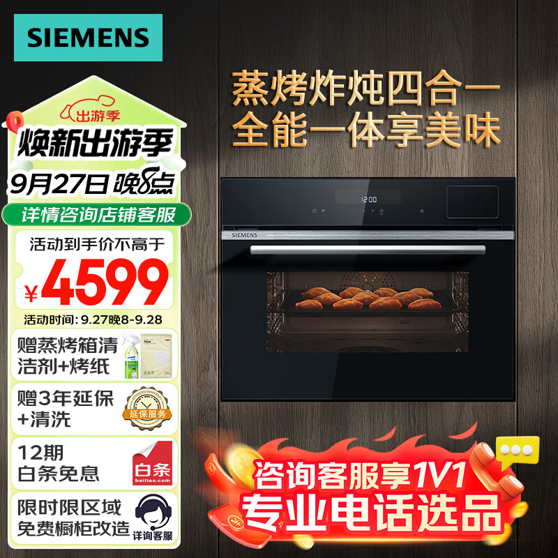 西门子(SIEMENS)嵌入式蒸烤炸炖四合一 自清洁 烤箱 蒸箱 热风炸 中式过温炖 家用蒸烤箱 CS8J4DNB1W价格:4598.00元!