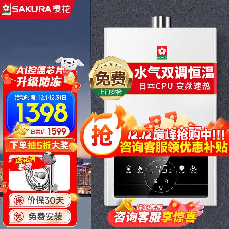 樱花(SAKURA)燃气热水器水气双调智能精控恒温直流变频降噪触控强排式热水器低压启动多重防护 16L NJP007AS防冻款价格:1699.00元!