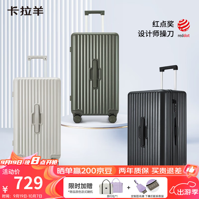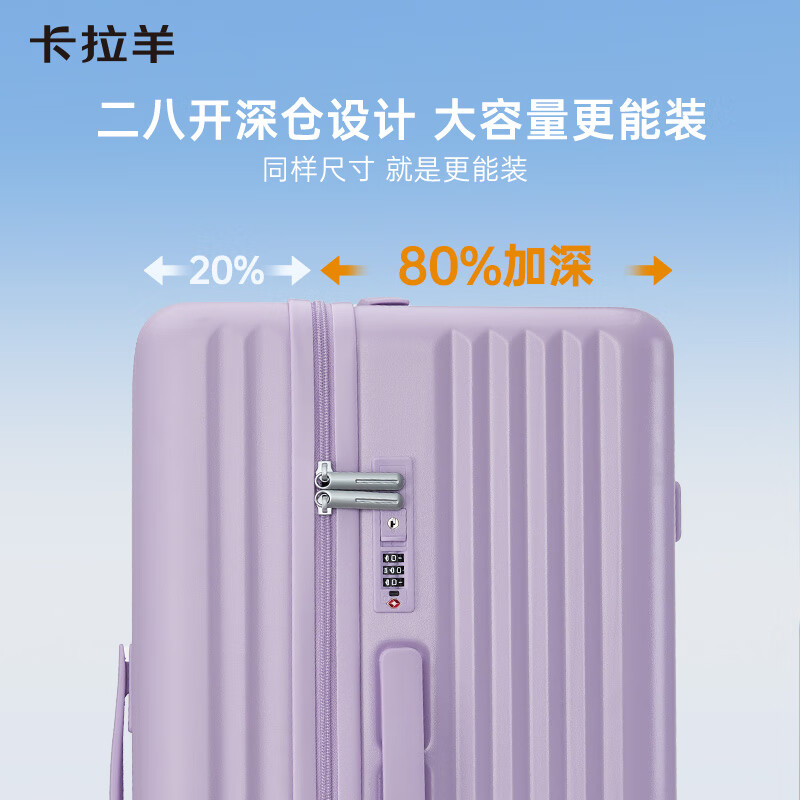 3、十年前买的卡拉羊20寸旅行箱,现在用着质量还很好,这次给孩子住校买,还是选卡拉羊。选的这款,箱体形状加宽条纹,里面有网布,感觉更好一些。