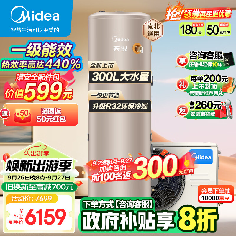 美的(Midea)空气能热水器家用300升大容量包安装超一级能效水洗R32冷媒天悦RSJF-51/N8-300C(E1)价格:7899.00元!