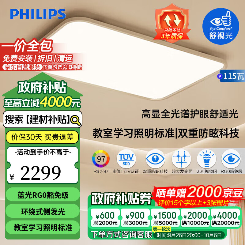 飞利浦(PHILIPS)LED全光谱护眼吸顶灯客厅灯书房儿童房灯饰灯具 EyeCare115W价格:2539.00元!
