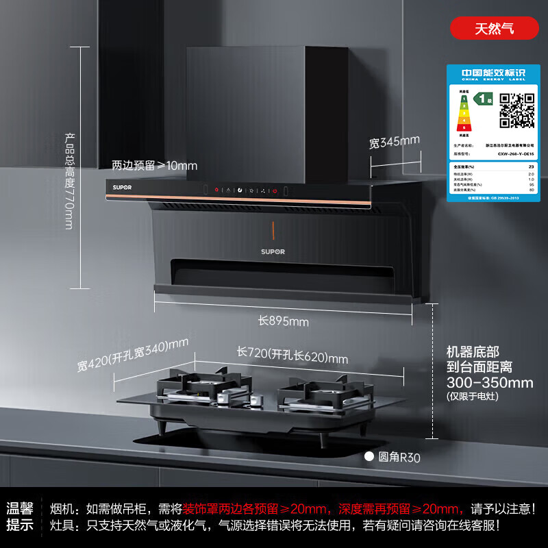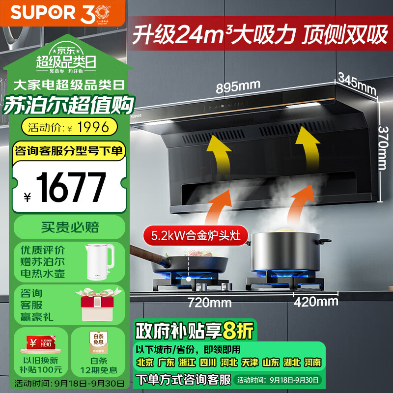 苏泊尔(SUPOR) 抽油烟机 顶侧双吸7字型烟灶套装24立方挥手免拆洗家用烟机燃气灶具套装DE15+DB27天然气价格:1996.00元!
