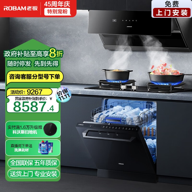 老板(Robam)探索家A8CS 25大风量抽油烟机15套洗碗机嵌入式独立式两用厨房多件套29A8CS+57B6DT+F80D黑价格:9282.00元!
