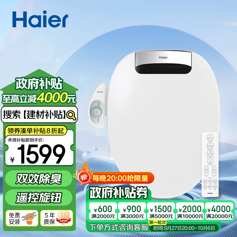 海尔(Haier)智能马桶盖 即热暖风款 遥控旋钮光感夜灯自动除臭 DF-28价格:1999.00元!
