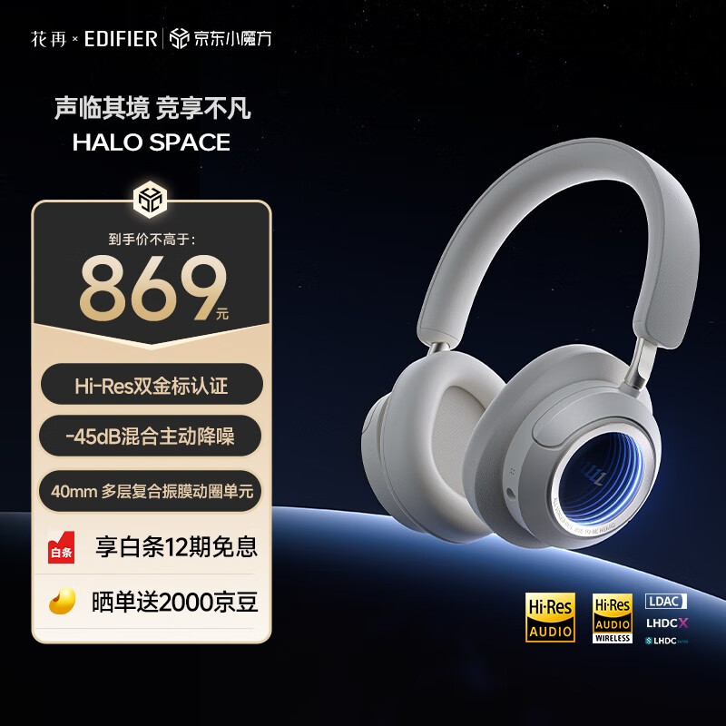漫步者花再Halo Space 无线蓝牙耳机 主动降噪耳机 头戴式耳机 舒适佩戴 空间音频 破晓白价格:869.00元!