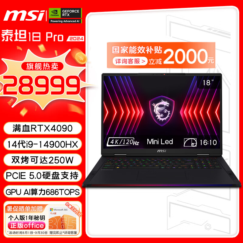 微星(MSI)【黑悟空推荐】泰坦18Pro 2024 14代酷睿i9-14900HX 18英寸游戏笔记本电脑64GB 2T RTX4090 4K屏价格:28999.00元!