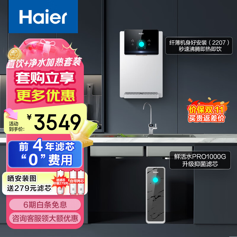 海尔(Haier)直饮加热净水器1000G鲜活水pro家用厨下反渗透【净热套装】净水机+管线机HKC2400-R791D2U1+R2207价格:3549.00元!