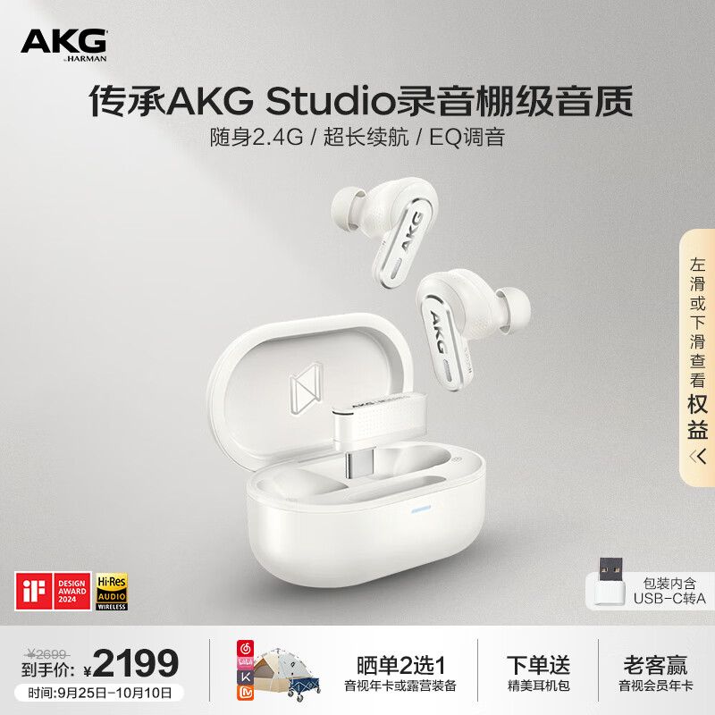 AKG N5 主动降噪高解析无线蓝牙HiFi耳机参考级音质 2.4G畅玩黑神话悟空平板电脑游戏音乐耳机 白色价格:2699.00元!