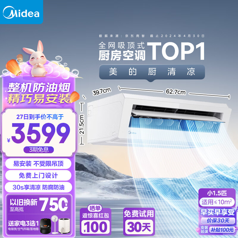 美的(Midea)厨清凉 厨房空调 专用吸顶式 小1.5匹变频 防油烟 大冷量 易安装CKF-30XW/BN8Y-XD300【极地白】价格:3499.00元!