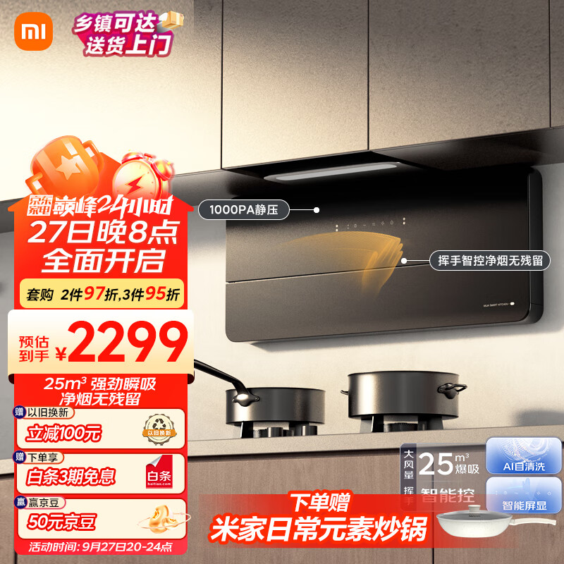 米家小米智能超薄近吸油烟机S1 25大吸力小尺寸智能变频侧吸抽油烟机 挥手智控烟灶联动以旧换新MJ07价格:2299.00元!