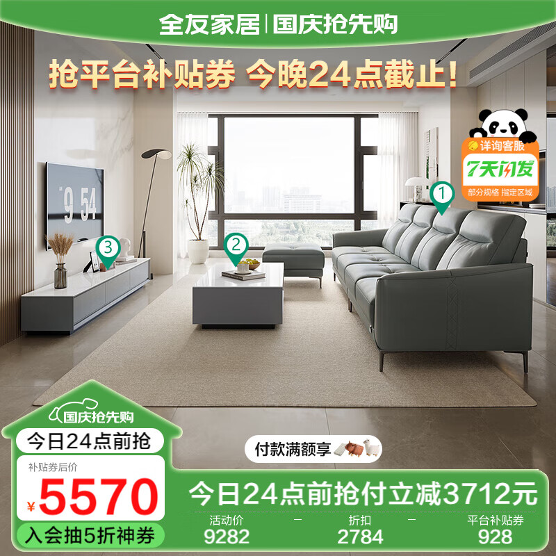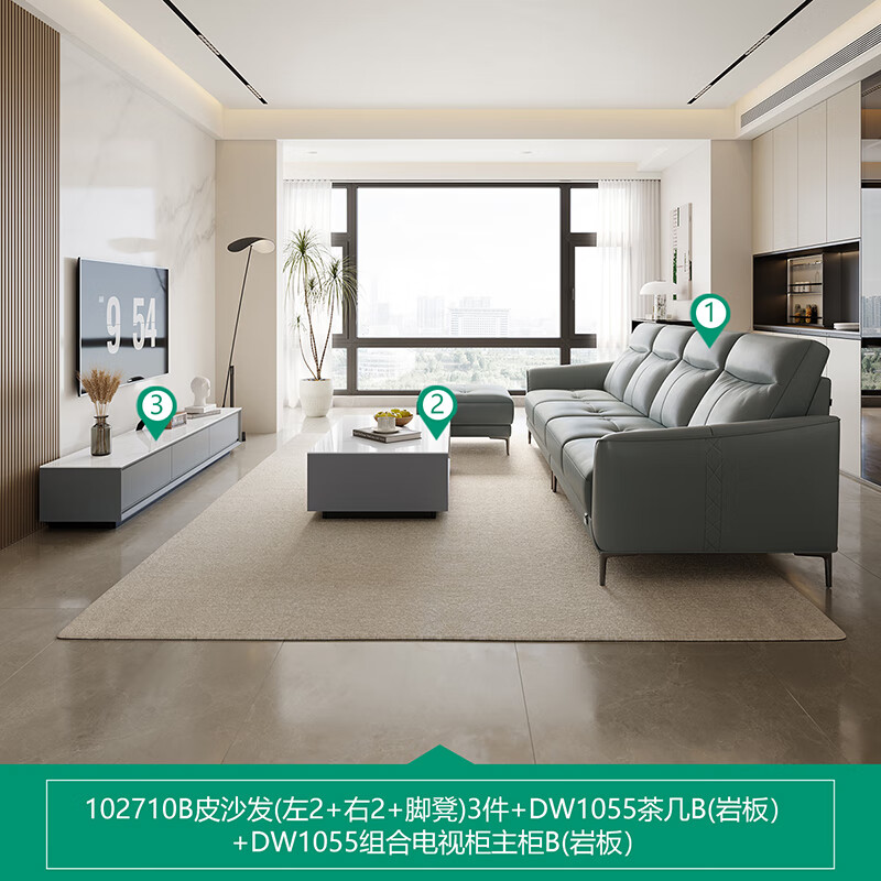 全友家居 简约客厅三件套装组合皮沙发岩板茶几电视柜主柜家具102710价格:9282.86元!
