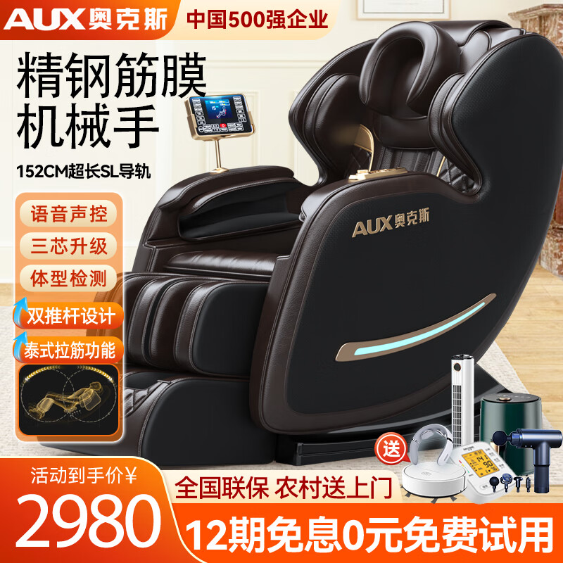 奥克斯【同价12.12】按摩椅家用太空舱全自动全身零重力电动智能多功能机械手双SL导轨沙发送爸妈长辈 黑棕色【双推杆设计+泰式拉筋+中控旋钮+语音】价格:3880.00元!