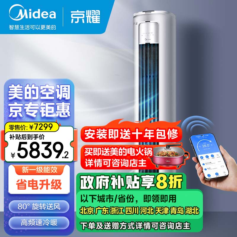 美的(Midea)3匹 京耀 变频冷暖 防直吹 新一级能效 客厅圆柱空调立式柜机 KFR-72LW/N8MXJ1价格:7299.00元!