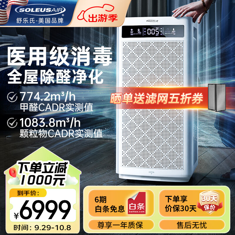 SOLEUSAIR舒乐氏空气净化器除醛除菌宠物吸附猫毛狗毛雾霾异味除花粉过敏原多重污染消毒机 卫健委备案 A10价格:6999.00元!