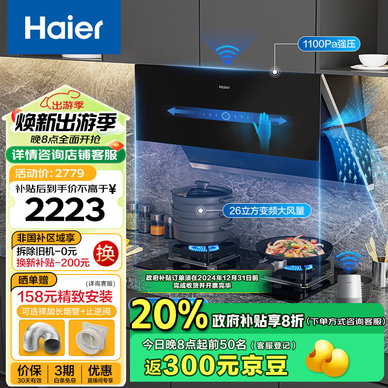 海尔(Haier)油烟机燃气灶套装 侧吸抽油烟机 26风量大吸力1100pa 5.2kw猛火灶 烟灶联动烟灶套装911UD+Q2BE9天价格:2899.00元!