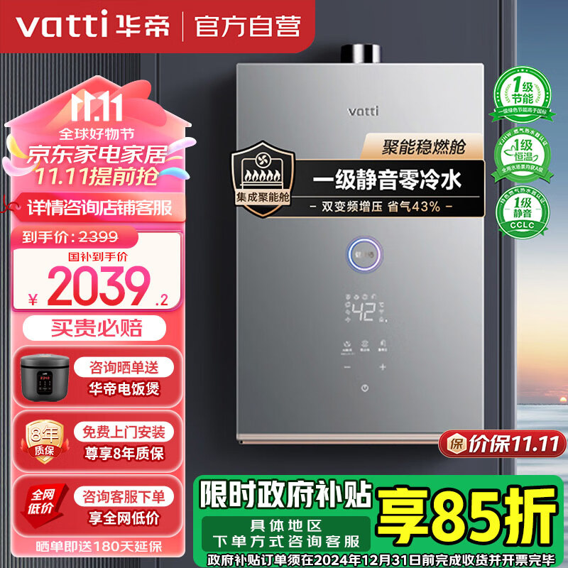 华帝(VATTI)政府补贴官方16升燃气热水器天然气零冷水一级静音双变频节能增压密闭恒温 i12268-16以旧换新价格:2399.00元!
