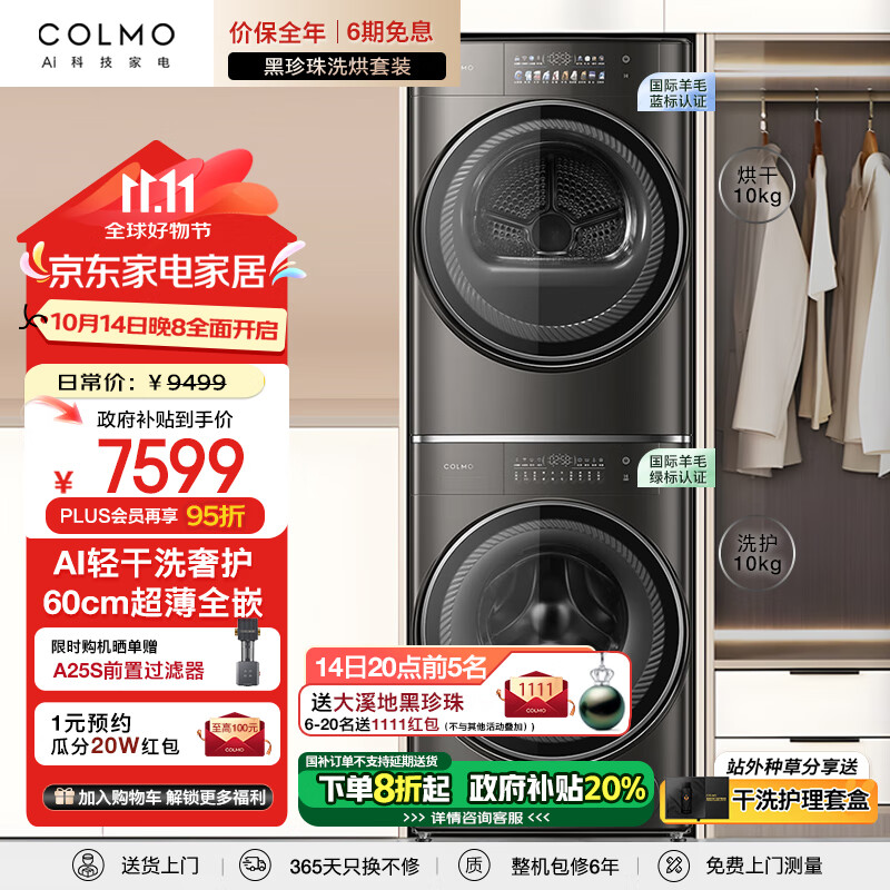 COLMO黑珍珠洗烘套装SE 10KG洗烘套装全自动洗衣机热泵烘干机 以旧换新洗超薄全嵌CLGN10HEL+CLHZ10HDL价格:10998.00元!