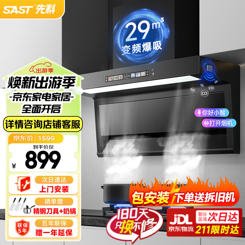 先科(SAST)顶侧双吸抽油烟机燃气灶烟灶套装家用厨房大吸力脱排式7字吸油烟机灶具套装 升级变频/29变频立方+烟感+语音+彩屏价格:1499.00元!