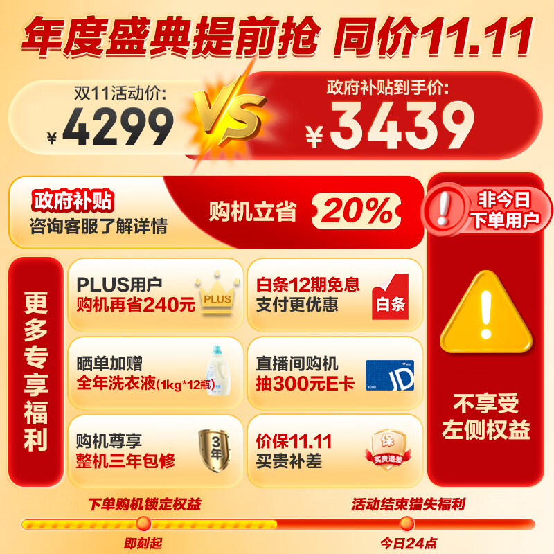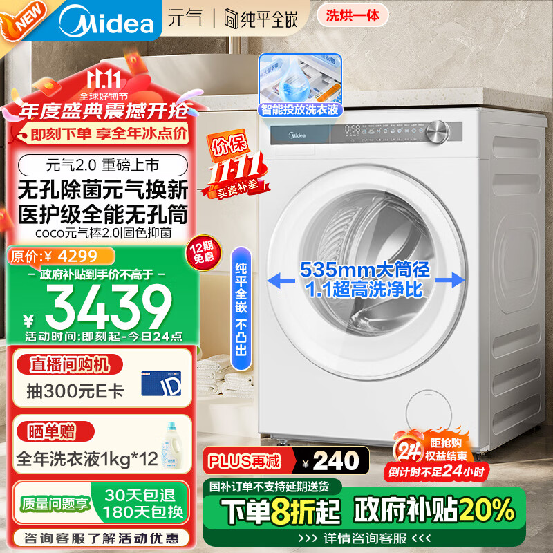 美的(Midea)滚筒洗衣机全自动家用 MD10L7PRO 10公斤洗烘一体机 纯平全嵌 元气2.0 以旧换新 家电国补补贴价格:4299.00元!