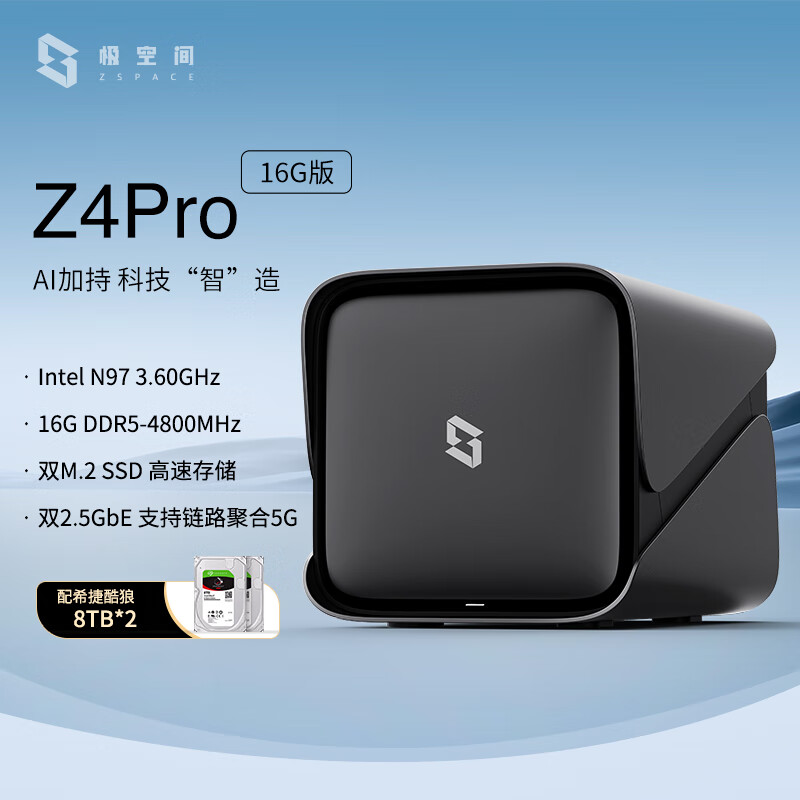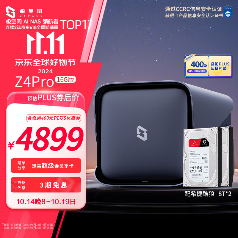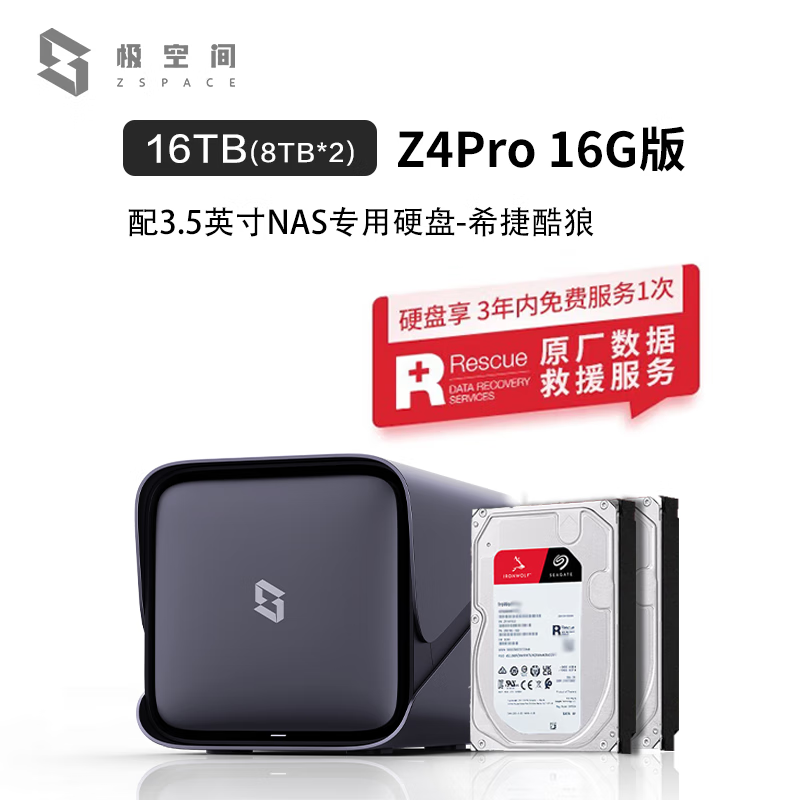 极空间私有云Z4Pro 16G版四盘位Nas网络存储家庭个人相册备份文件同步【配2块8T希捷酷狼硬盘】钛金灰价格:5899.00元!