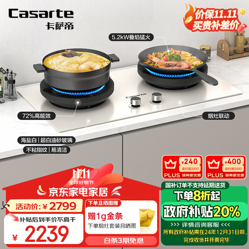 卡萨帝(Casarte)星悦小炫风 燃气灶天然气 白色百搭灶具 5.2kw大火力 72%高热效 叠焰猛火台嵌两用CDZ5U9(天然气)价格:2799.00元!