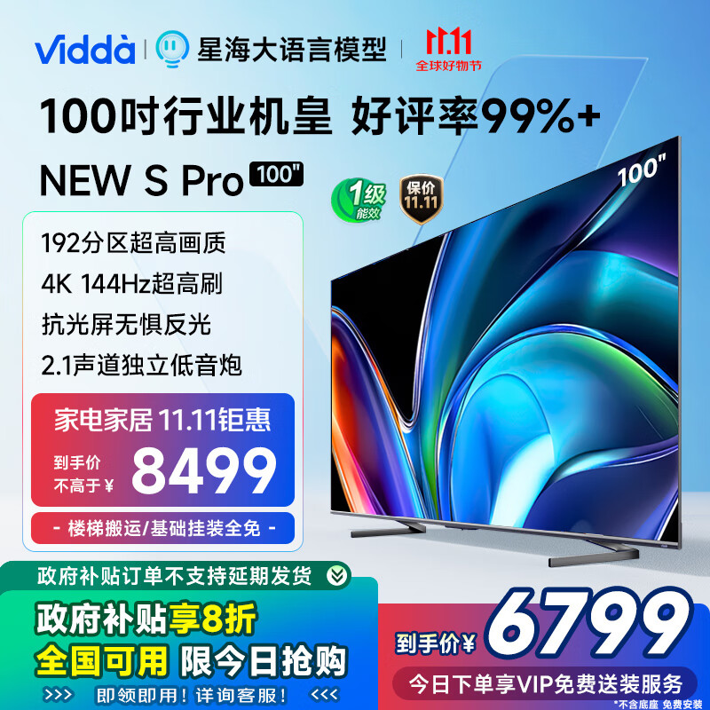 Vidda NEW S100 Pro 电视100英寸 一级能效 192分区 4+128G 家电以旧换新补贴液晶游戏电视100V1N-PRO价格:8499.00元!