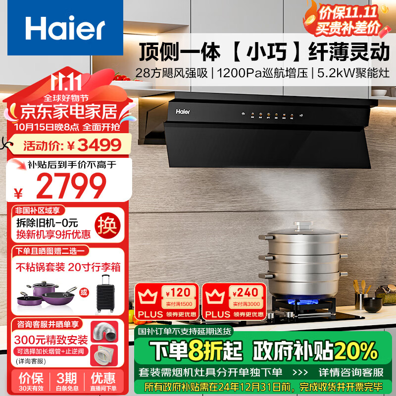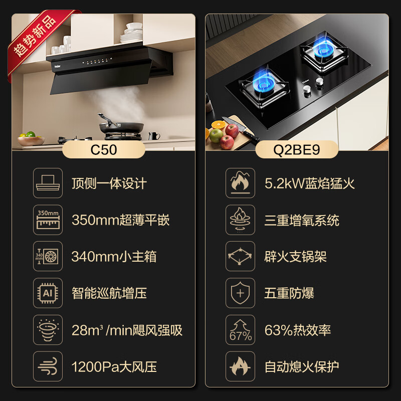 海尔(Haier)抽油烟机 【小巧】烟灶套装欧式顶侧一体 超薄平嵌欧近一体 变频28风量大吸力 5.2kw天然气C50+BE9价格:4110.00元!