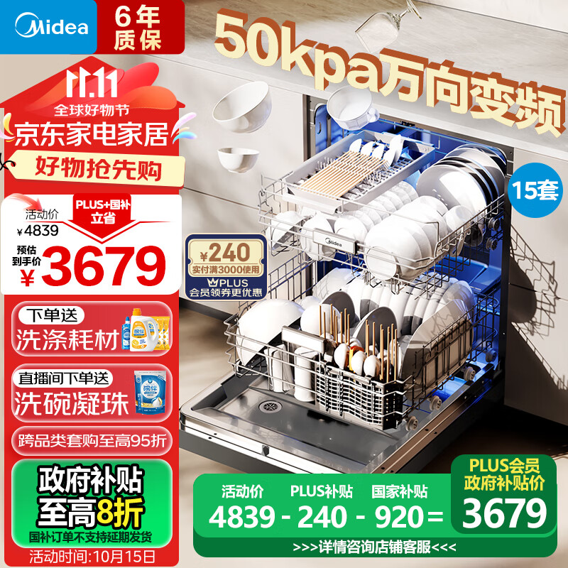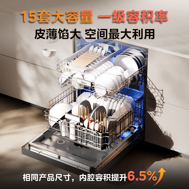 美的(Midea)嵌入式洗碗机万向X6Pro 15套一级容积率105℃热风烘干四星消毒7天存储变频自清洁滤网洗消一体机价格:4839.00元!