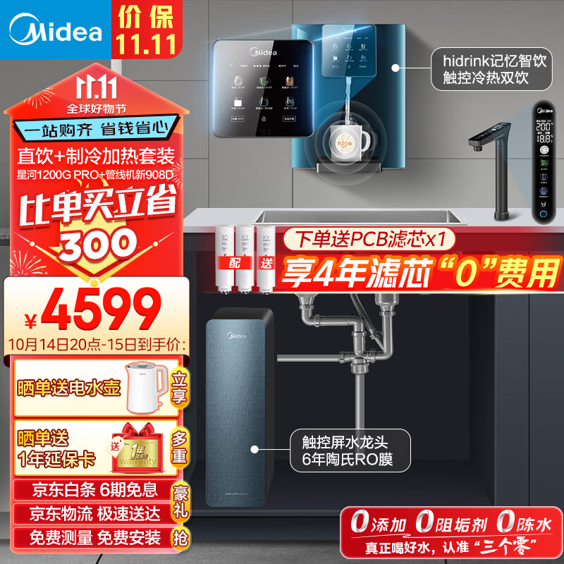 美的(Midea)直饮冷热净水器套装【星河1200pro+管线机908D升级版】hidrink智能 家用壁挂式即热一体净饮机价格:4599.00元!