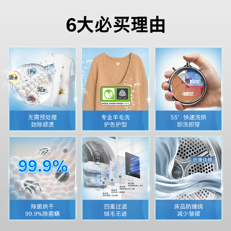 2、这个新款云朵白四系首先是颜值吸引了我,这次618性价比也很好,新款洗衣机增加了随心定时和自动除渍,新款干衣机增加了正反转,洗了四件套不会缠绕,烘干效果和绒毛过滤也不错,声音不大。