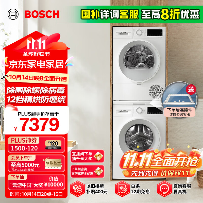 博世(BOSCH)【云朵白主推】洗烘套装10KG大容量全自动洗衣机热泵烘干机一级能效152000+252U0A 以旧换新价格:7899.00元!