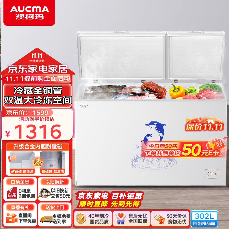 澳柯玛(AUCMA)302升 冰柜家用双温双箱商用家用大容量冰柜卧式冰柜囤货冷柜冷藏全铜管BCD-302CNE以旧换新价格:1399.00元!