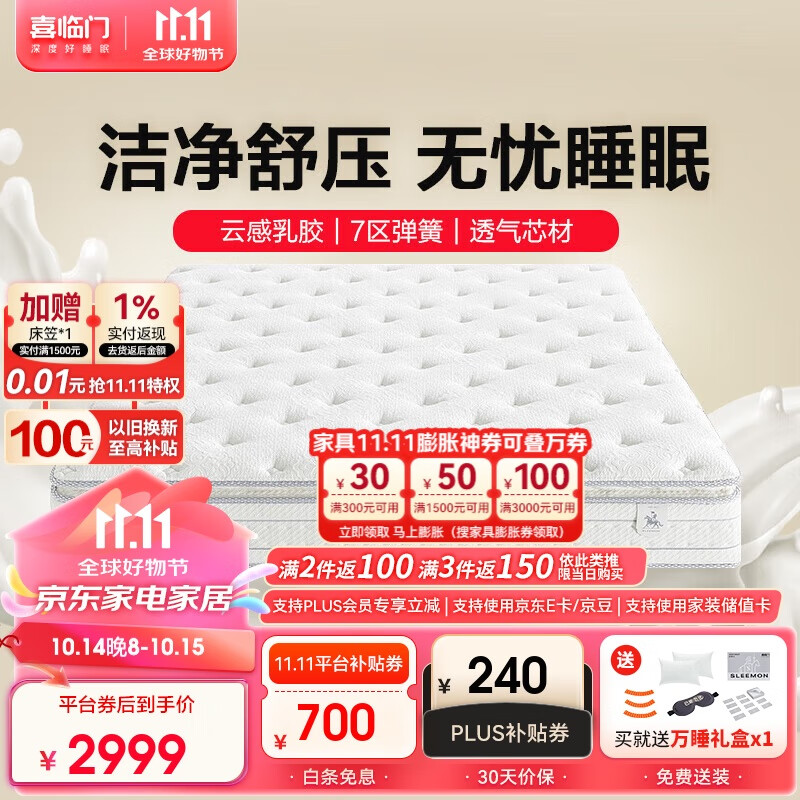 喜临门床垫 2cm高纯乳胶7区分区弹簧床垫透气芯材床垫 白骑士pro1.8x2米价格:3699.00元!