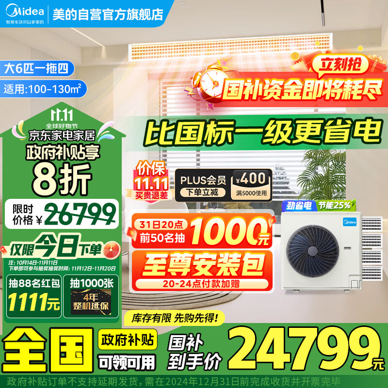 美的(Midea)中央空调一拖四多联机大6匹星光全直流变频新一级能效智能除菌自清洁以旧换新MDS-160W-X6-(1)Ⅲ价格:26799.00元!
