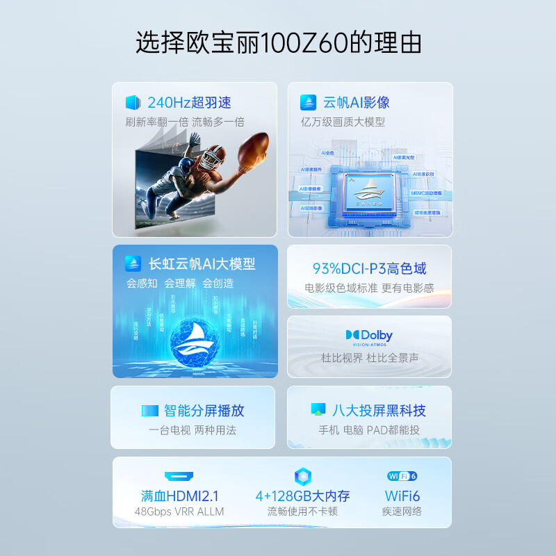 1、家里重新装修,因原来的电视太小,想换个大的,一步到位就选100寸那种,选来选去,对不同品牌同尺寸电视进行了参数对比,此款长虹欧宝丽100z60各方面参数相对较强,到货后使用体验很好,内存大,刷新率高,光感强,色彩细腻,特别是看电影,足球赛,影院即视感非常强,是一款性价比极高的百寸电视,值得购买。