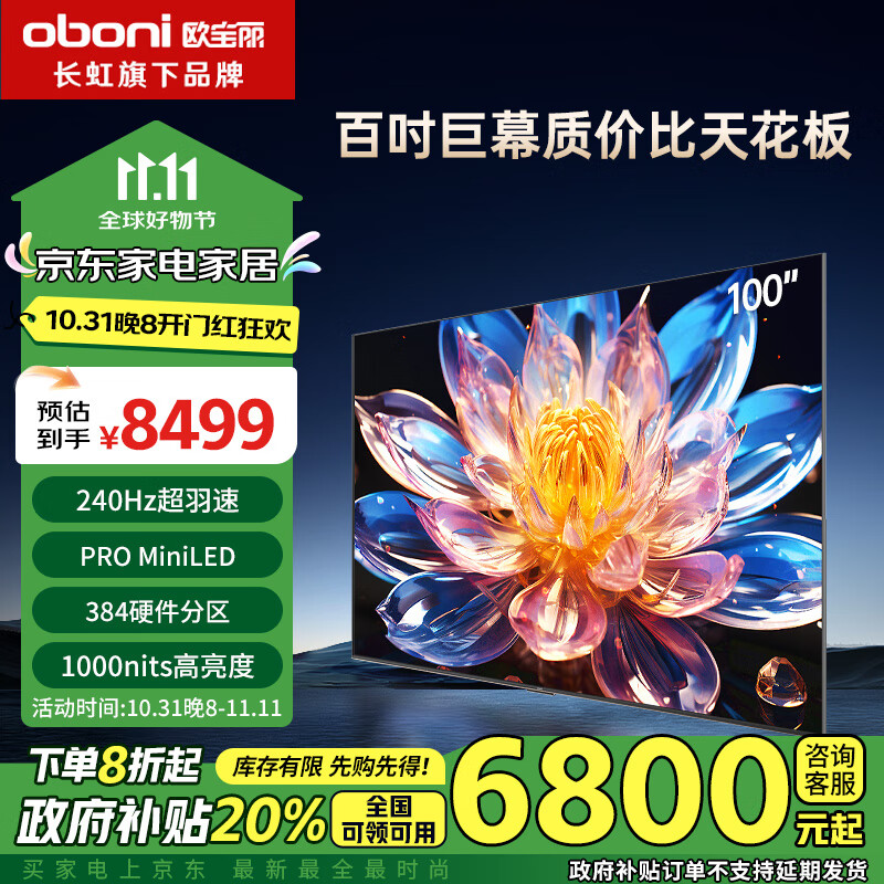 长虹电视欧宝丽100Z60 100英寸4K MiniLED巨幕 98英寸+智能液晶会议平板电视 以旧换新一级能效补贴价格:8499.00元!