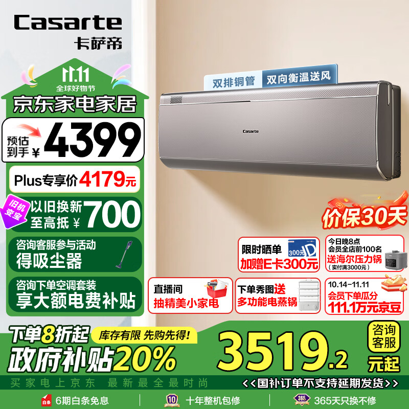 卡萨帝(Casarte)1.5匹 名匠 双向衡温送风 空调挂机 一级能效 智能变频 CAS3512FCA(81)U1政府补贴以旧换新价格:4268.30元!