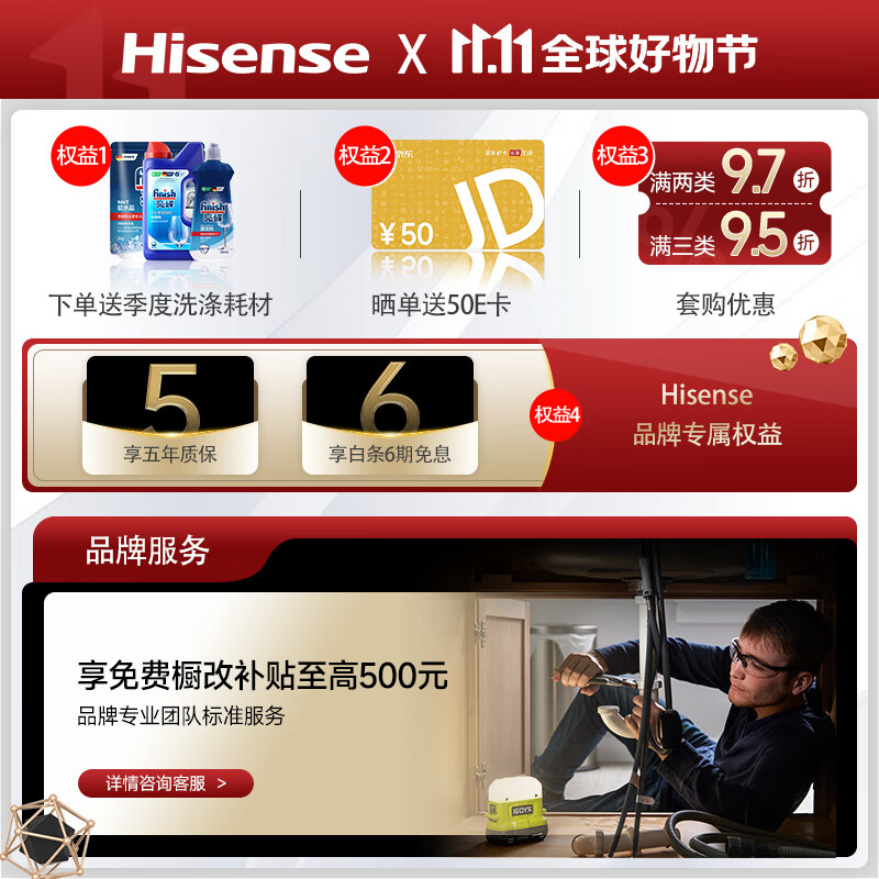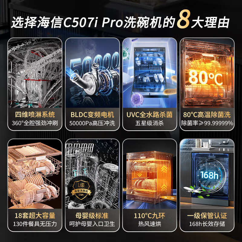 海信(Hisense)净水洗碗机家用嵌入式18套三层满载可调变频UVC五星消毒母婴认证110℃热风烘干一级保管C507iPro价格:4699.00元!