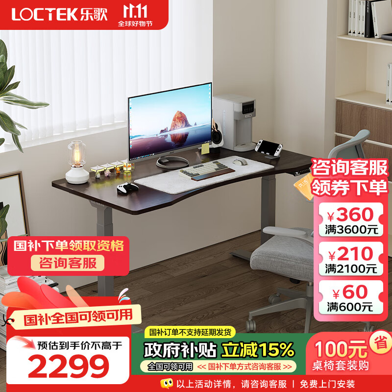 乐歌电动升降桌电脑桌双电机站立办公 E3/1.4m 凹型实木黑胡桃木色价格:2699.00元!