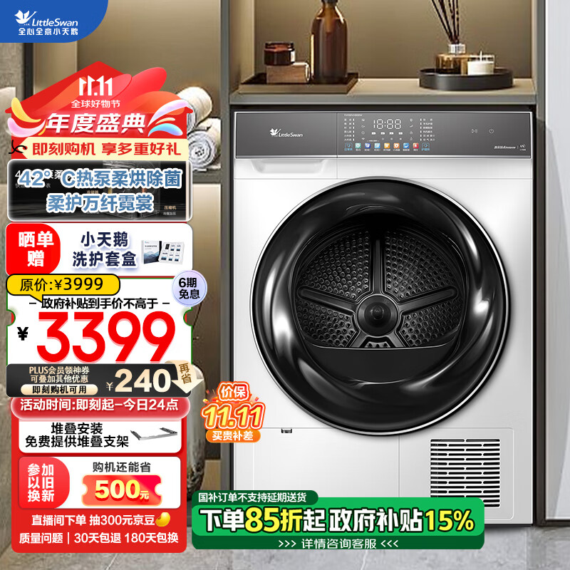 小天鹅(LittleSwan)热泵烘干机家用 干衣机 10公斤 除菌除螨 衣干即停 毛屑过滤 TH100VH806W价格:3999.00元!