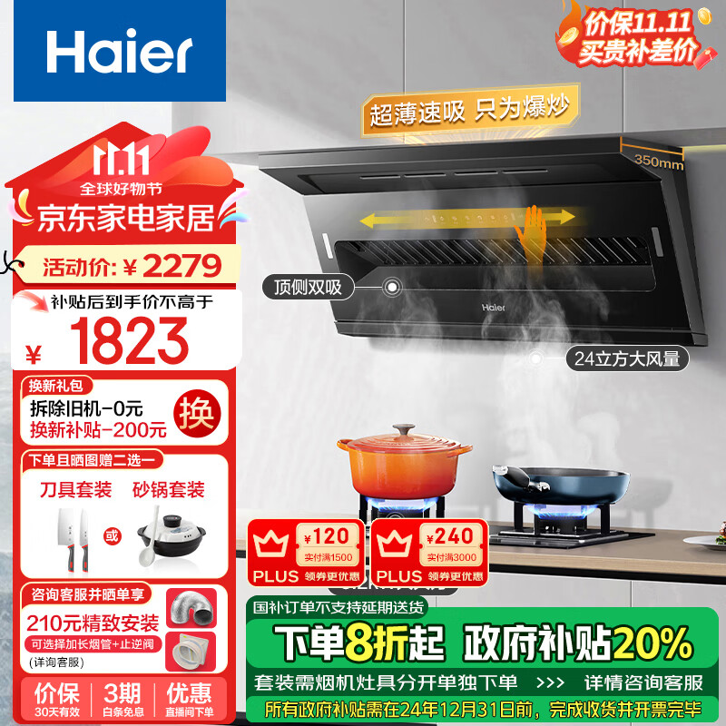 海尔(Haier)抽油烟机顶侧双吸 24m3/min大吸力 挥手智控 家用厨房吸油烟机天然气灶套装 齐平橱柜C51+Q2BE3价格:2399.00元!