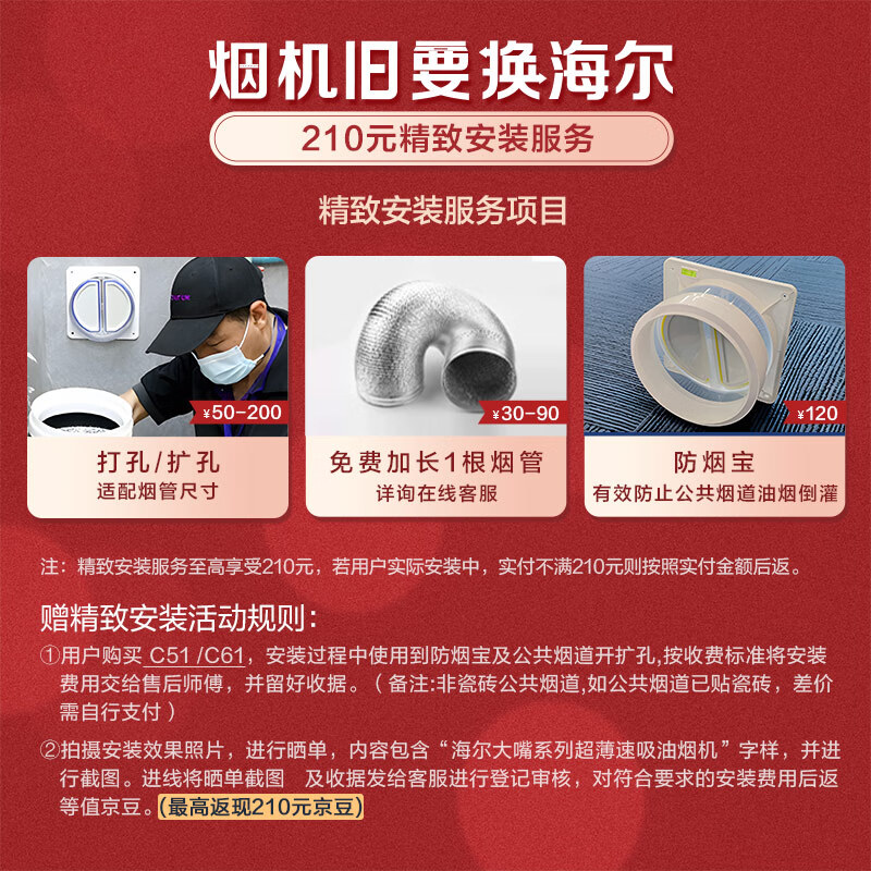 1、海尔超薄速吸-大嘴系列油烟机,外观好看,当天到,当天安装,师傅态度好!