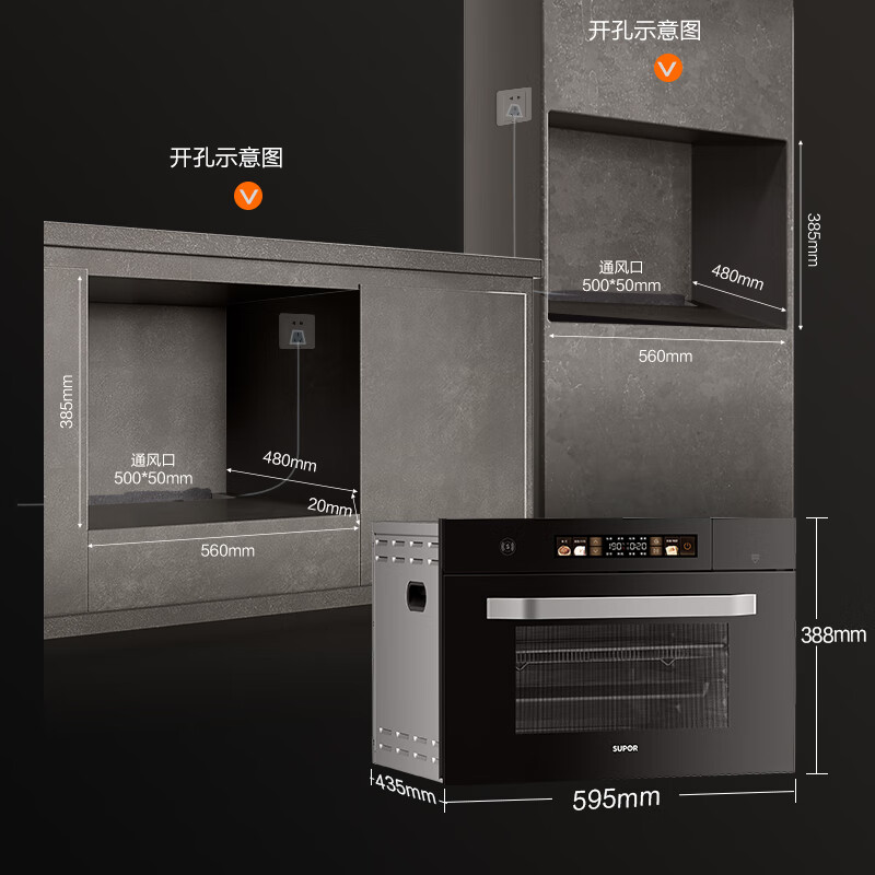2、整体较好,蒸炸炖烤功能都有,触摸方便。有两个托盘和一个炸架子,性价比较高。开孔时尺寸按这款做的,大小合适。蒸过以后里面水很多,需要手工擦。