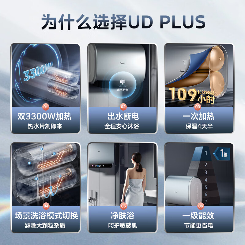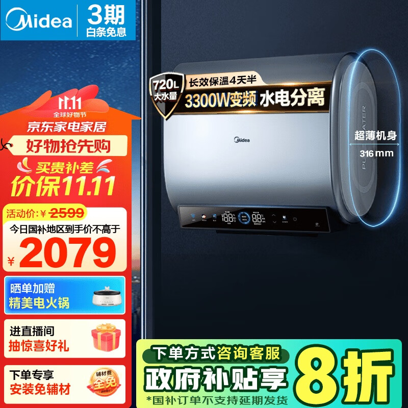 美的(Midea)80升玲珑超薄双胆扁桶电热水器3300W变频 镁棒免换出水断电净肤F8033-UDplus一级能效以旧换新价格:2599.00元!