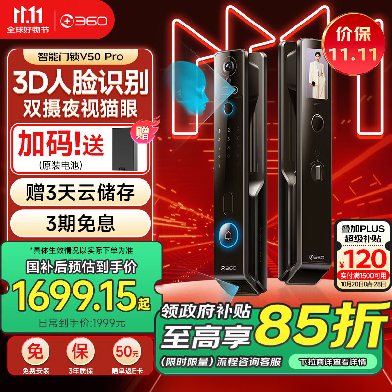 360智能门锁V50Pro 3D人脸识别夜视全自动智能门锁指纹锁密码锁双摄像头猫眼大屏防盗门锁电子锁价格:2599.00元!