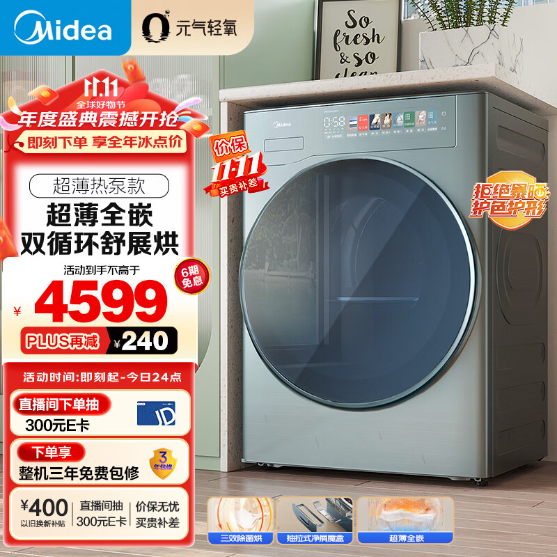 美的(Midea)10公斤热泵烘干机 干衣机家用 元气轻氧 超薄全嵌 分级除菌 毛屑净滤 MH100IAIR3价格:4599.00元!