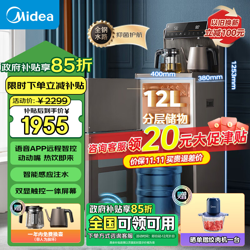 美的(Midea)茶吧机 饮水机家用 茶吧柜高端客厅办公下置式 免安装背板 触控显屏YR1803S-X【不锈钢管路】价格:2299.00元!