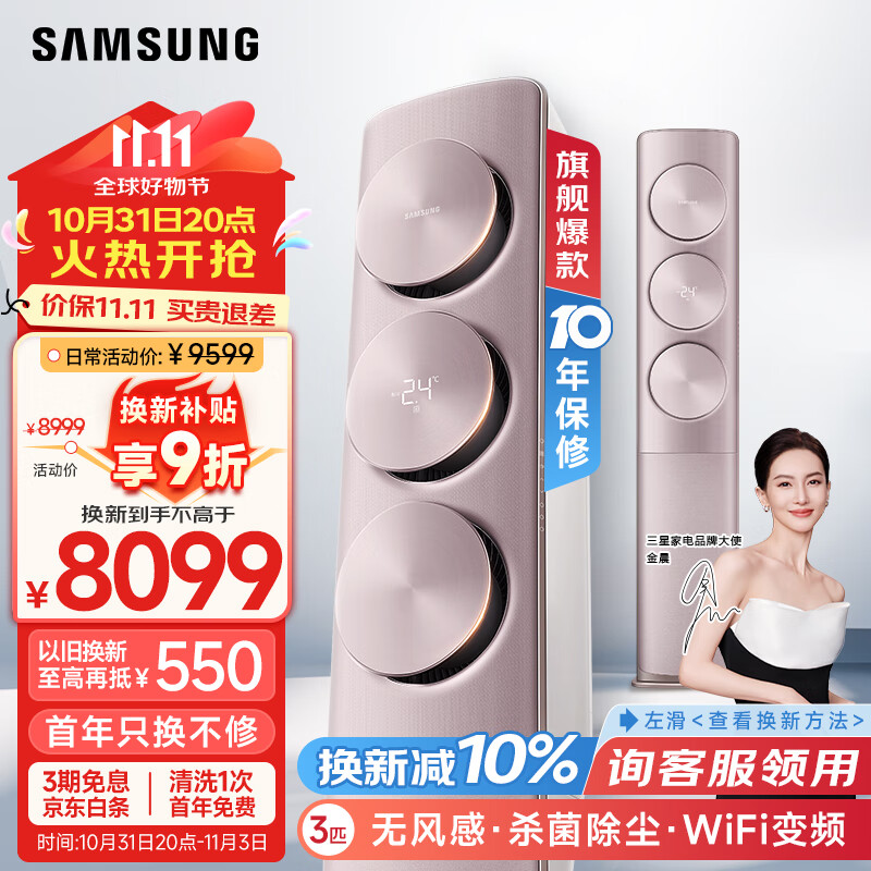 三星空调3匹新三级能效无风感柜机立式WIFI全直流变频除菌冷暖空调 38-50㎡ 换新补贴 KFR-72L/EBB3价格:9599.00元!